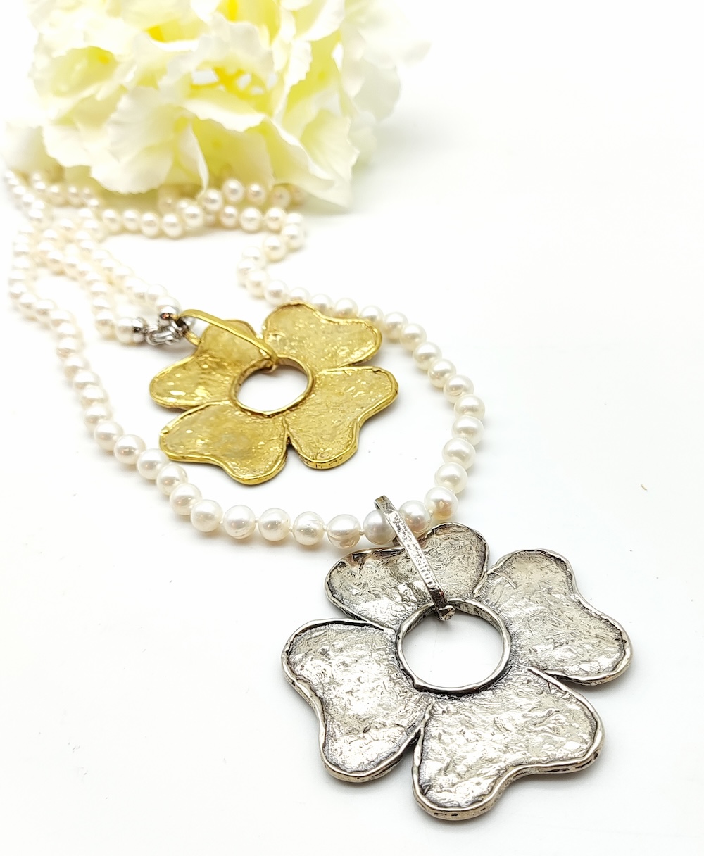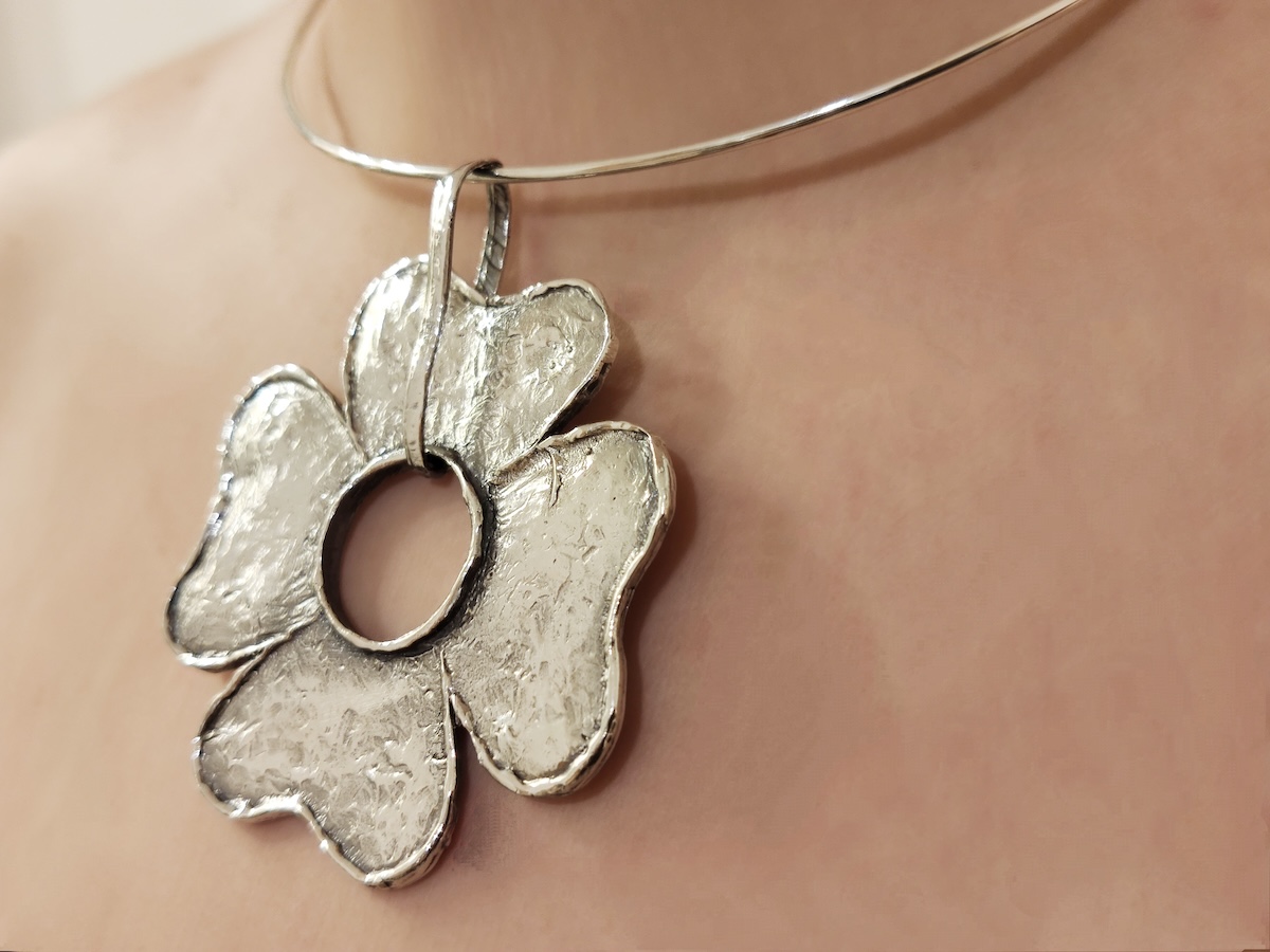 Ciondolo con quadrifoglio in argento completo di girocollo rigido in argento.