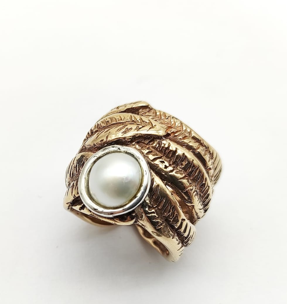 Anello in bronzo con motivi a foglie e perla mabè naturale