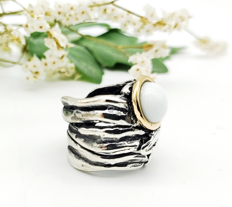 Anello fascia in argento con foglie cesellate e castone in bronzo con agata bianca