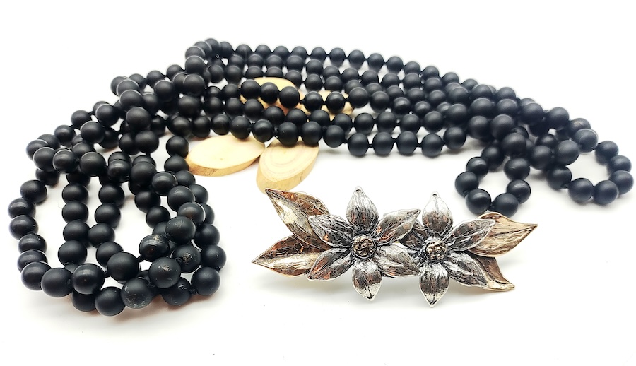 Collana con elemento floreale in argento e bronzo staccabile e 2 fili di agata nera satinata