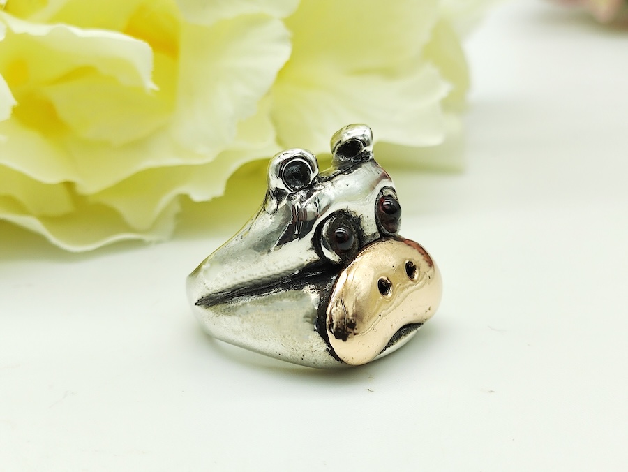 Anello con ippopotamo in argento e bronzo con occhi in granato
