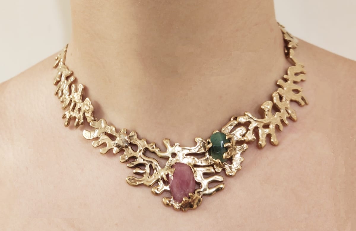 Tutti gli elementi di questa linea sono pezzi unici: il metallo fuso cola accidentalmente sul banco e ingloba le pietre grezze pronte per essere rifinite, creando forme fluide e irregolari. Le pietre sono su richiesta e disponibilità.