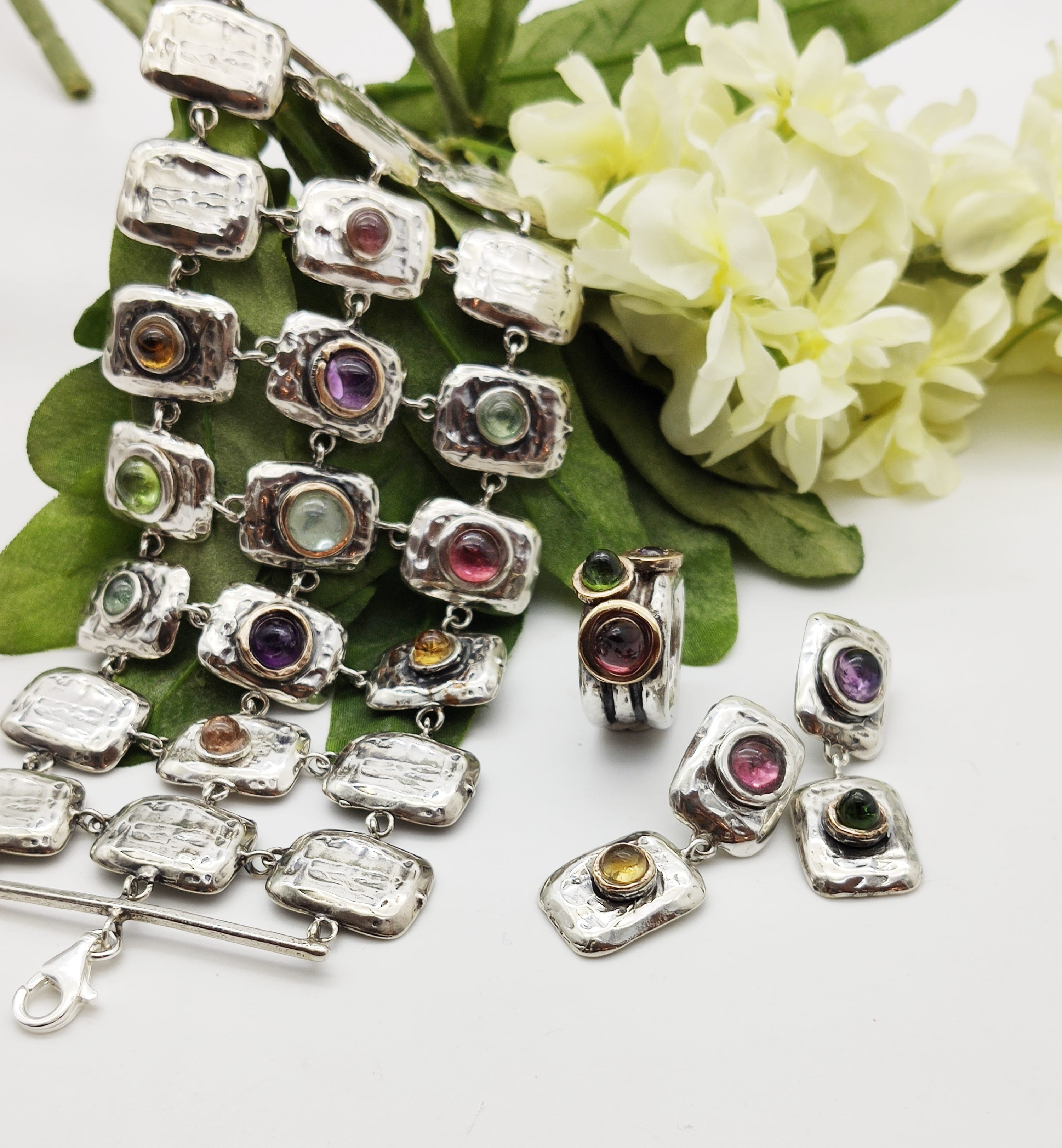 Bracciale in argento 925‰. e pietre (tormaline, topazi citrini, ametiste, acquamarine, peridoti). Disponibile variante in bronzo