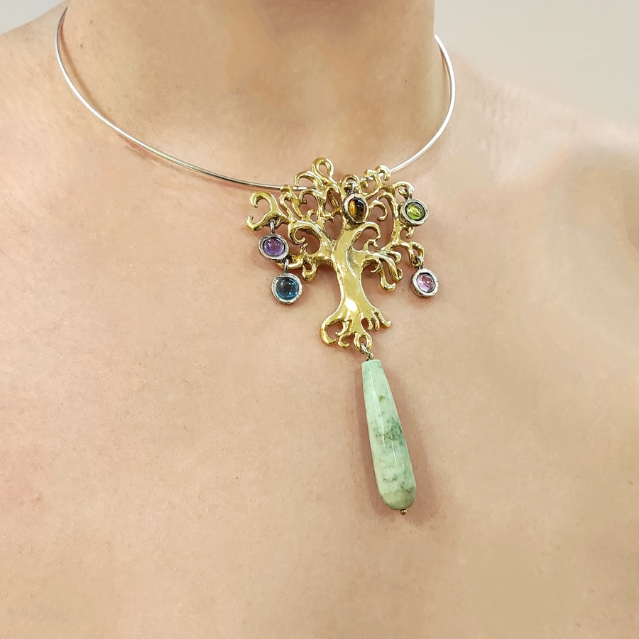 Ciondolo in bronzo con girocollo rigido in bronzo e castoni argento e pendenti in argento con tormaline e goccia di crisoprasio. Completo di girocollo rigido argento