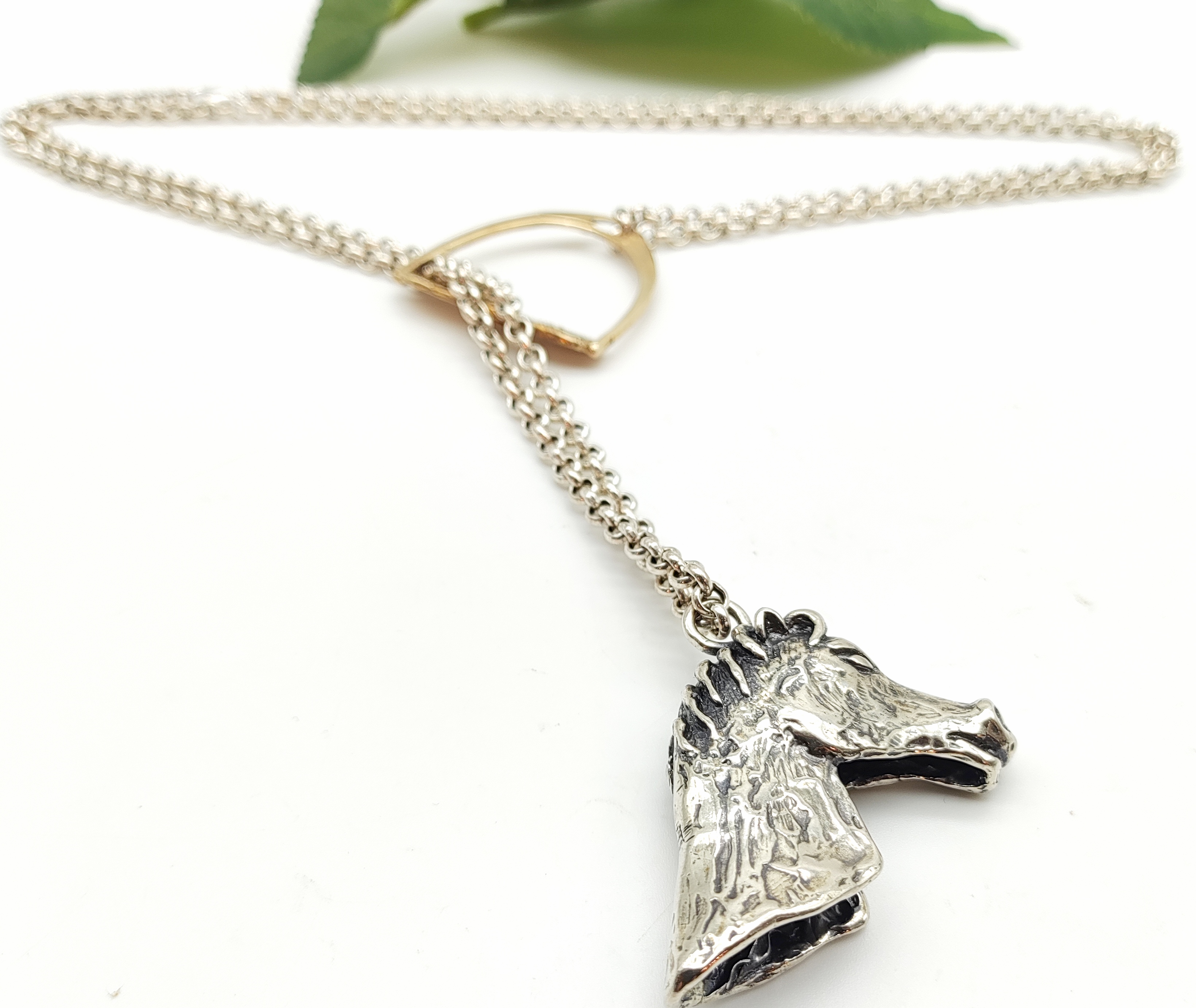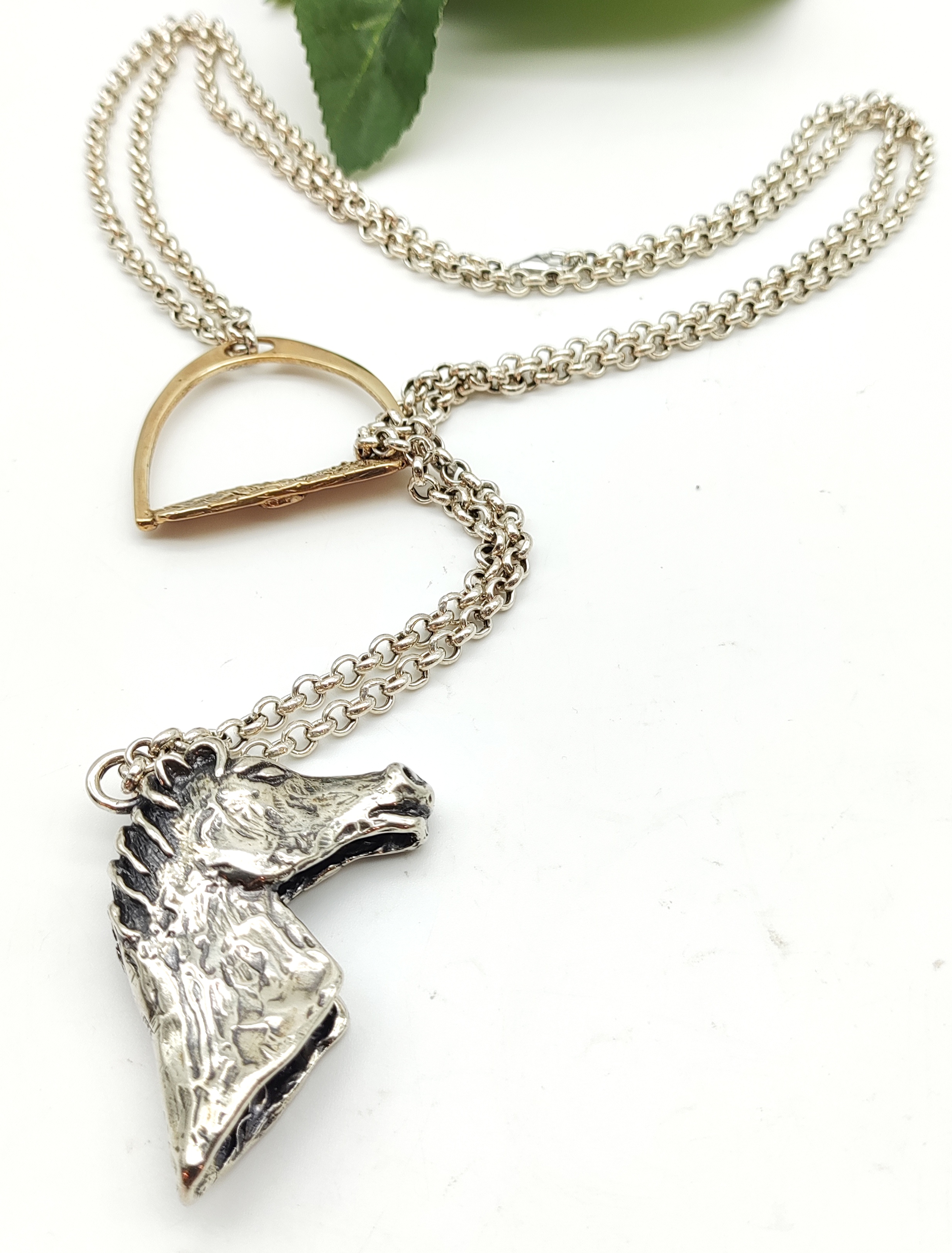 Collana con catena e testa di cavallo in argento. La staffa è in bronzo.