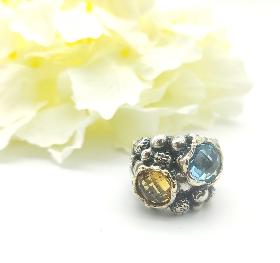 Anello in argento, castone in oro con topazio azzurro e topazio giallo