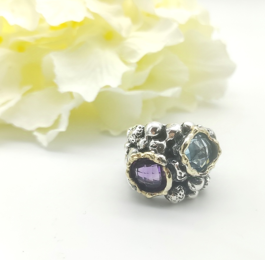 Anello in argento, castone in oro con topazio giallo, prasiolite
