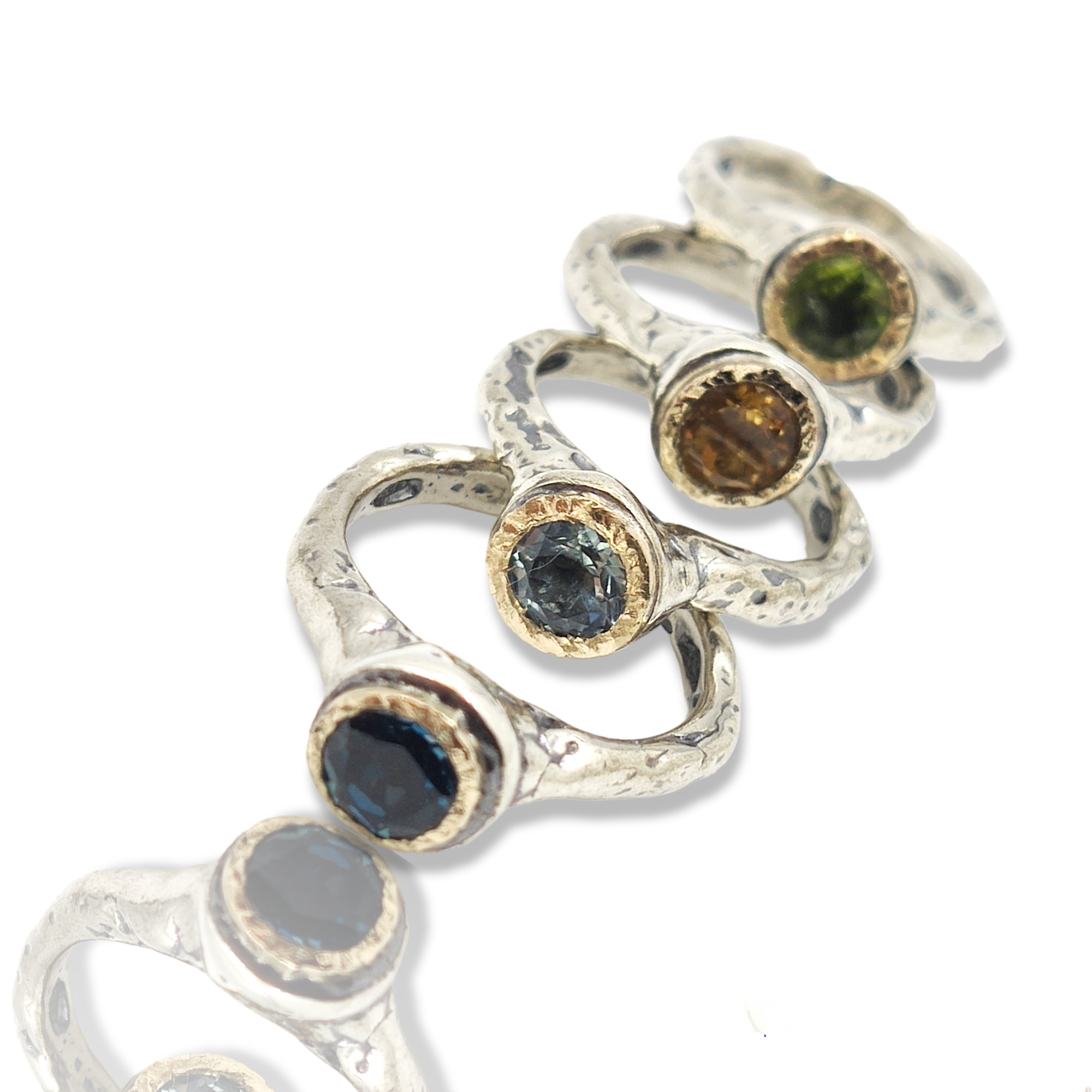 Anello in argento 925‰, castone in oro 9 kt con pietra di colore naturale a scelta tra peridoti, tormaline, topazi, ametiste, citrini.