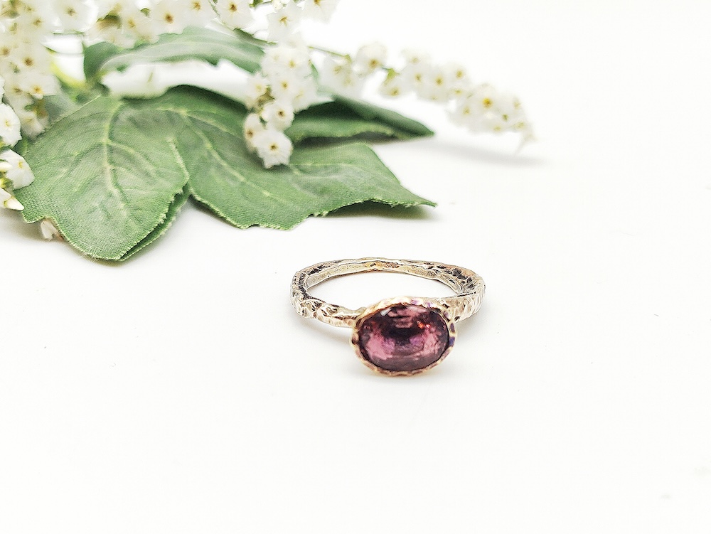 Anello in oro 9 kt con tormalina, realizzabile anche con topazio azzurro o giallo, acquamarina, ametista, tormalina.