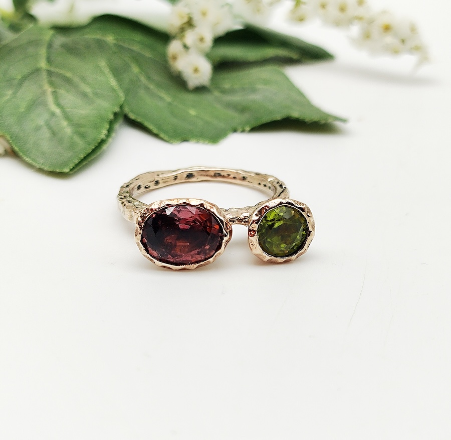 Anello in oro 9kt con due pietre, tormalina e peridoto.