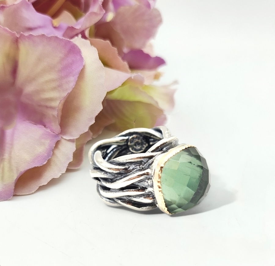 Lavorazione a filo in argento con castone in oro 9kt e quarzo tormalinato