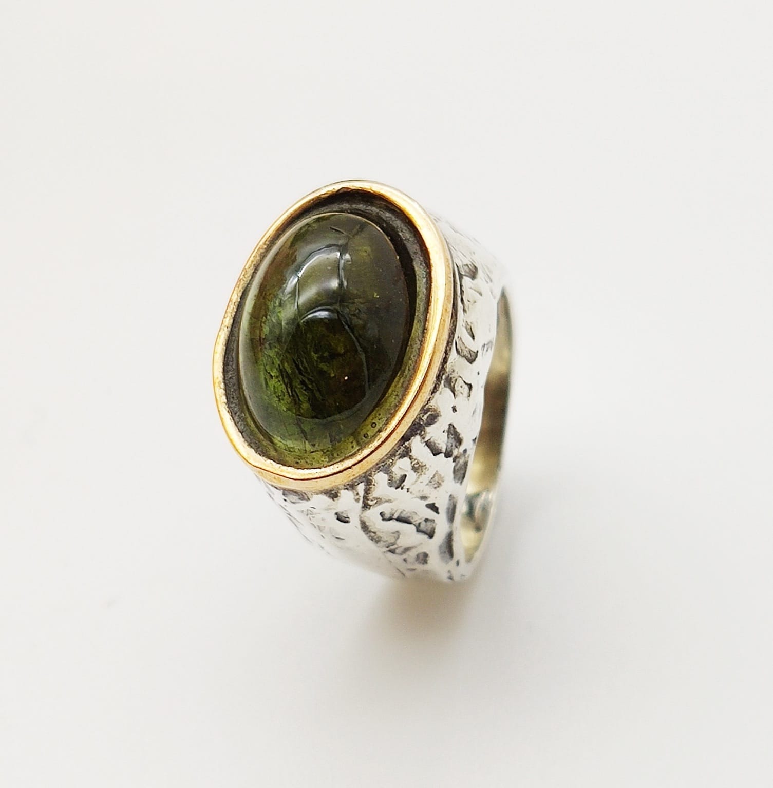 Anello mignolo in argento 925‰ con castone in bronzo e pietra prasiolite verde