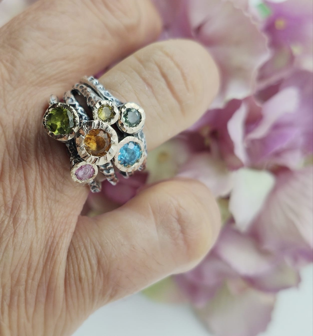 Anello con 4 fascette in argento, castone in oro con diamanti e zaffiri multicolor
