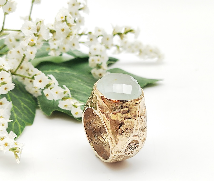Anello realizzato in pezzo unico simili ma mai identici in bronzo ed acquamarina milk dal taglio irregolare.