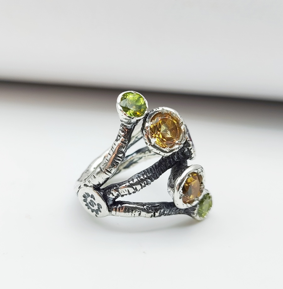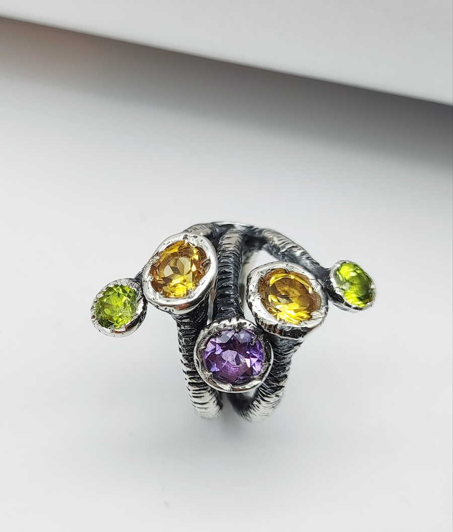 Anello in argento con cinque pietre naturali, disponibile in diverse varianti di colore: peridoto, tormalina, topazio citrino o sky, prasiolite, ametista.