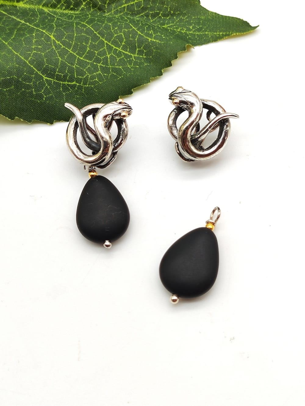 Orecchini "Anaconda Avvolta" in argento e dettagli in oro (9kt) con perla intercambiabile. Su richiesta si possono avere altre pietre pendenti: perle, agata bianca, rosa, azzurra o verde.