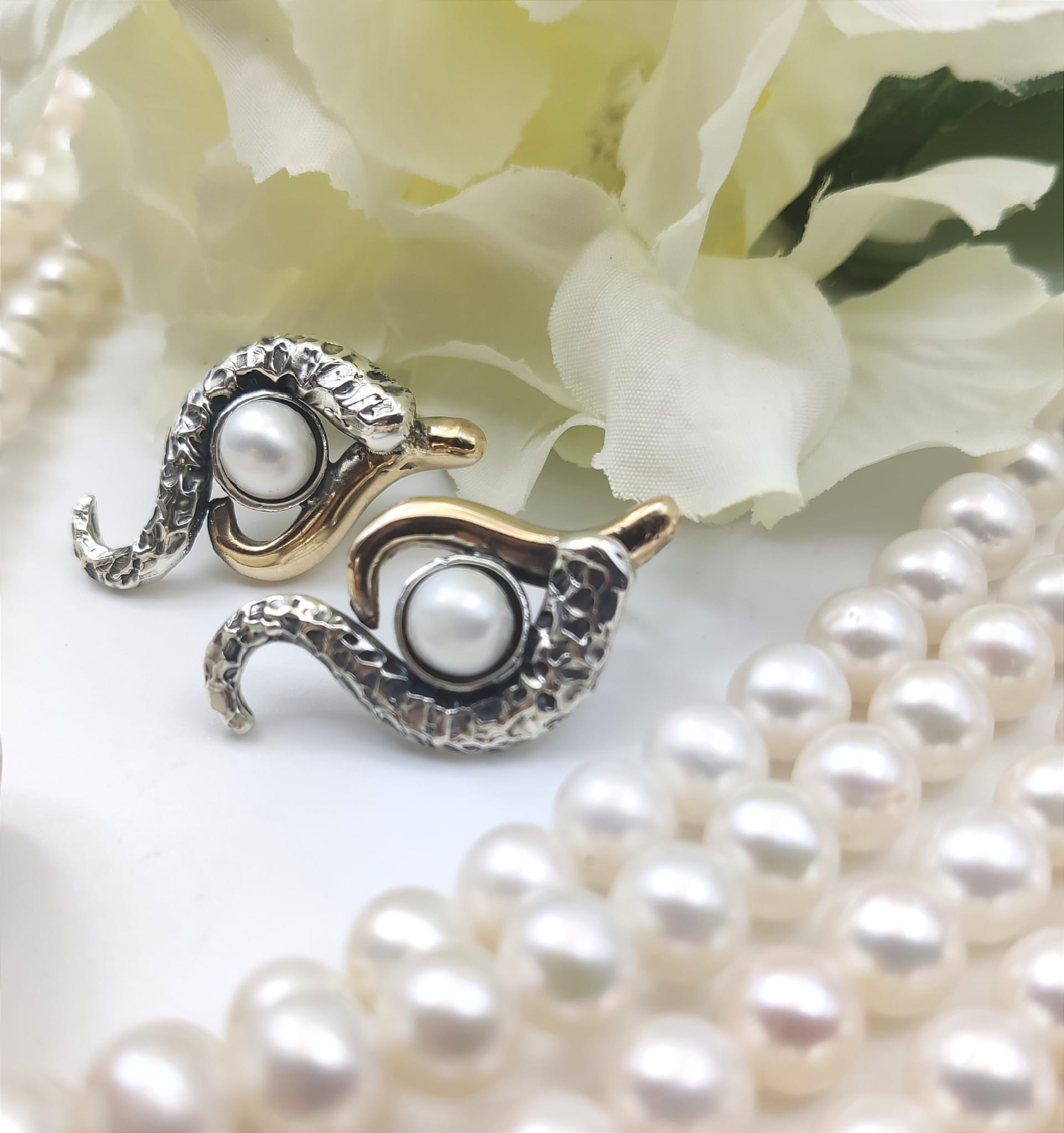 Collana in perle con anaconde in argento 925‰ e bronzo, occhi in oro 9 Kt e diamanti