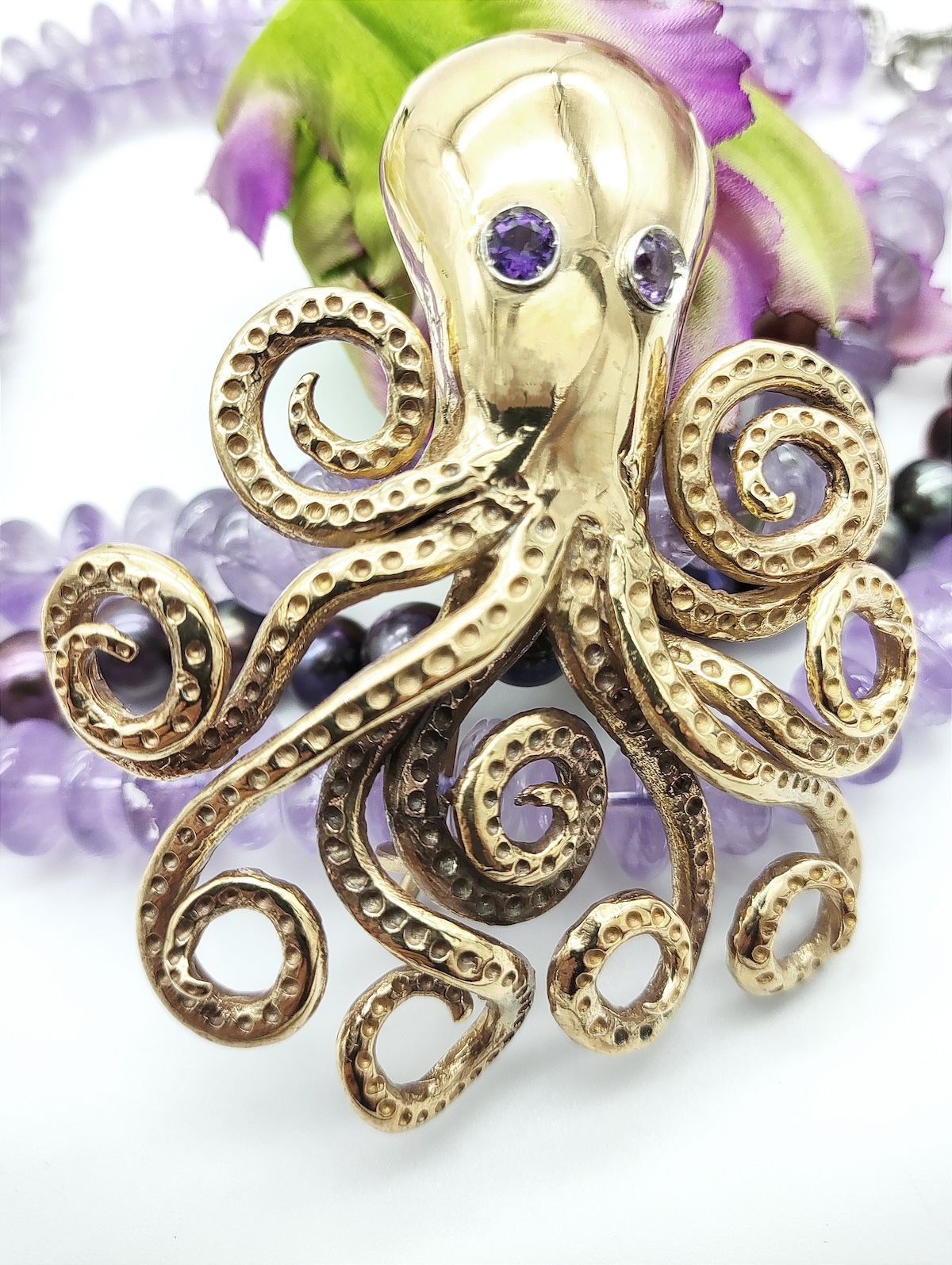 Ciondolo polpo con tentacoli in bronzo, zaffiri gialli e collana con perle e ametiste.