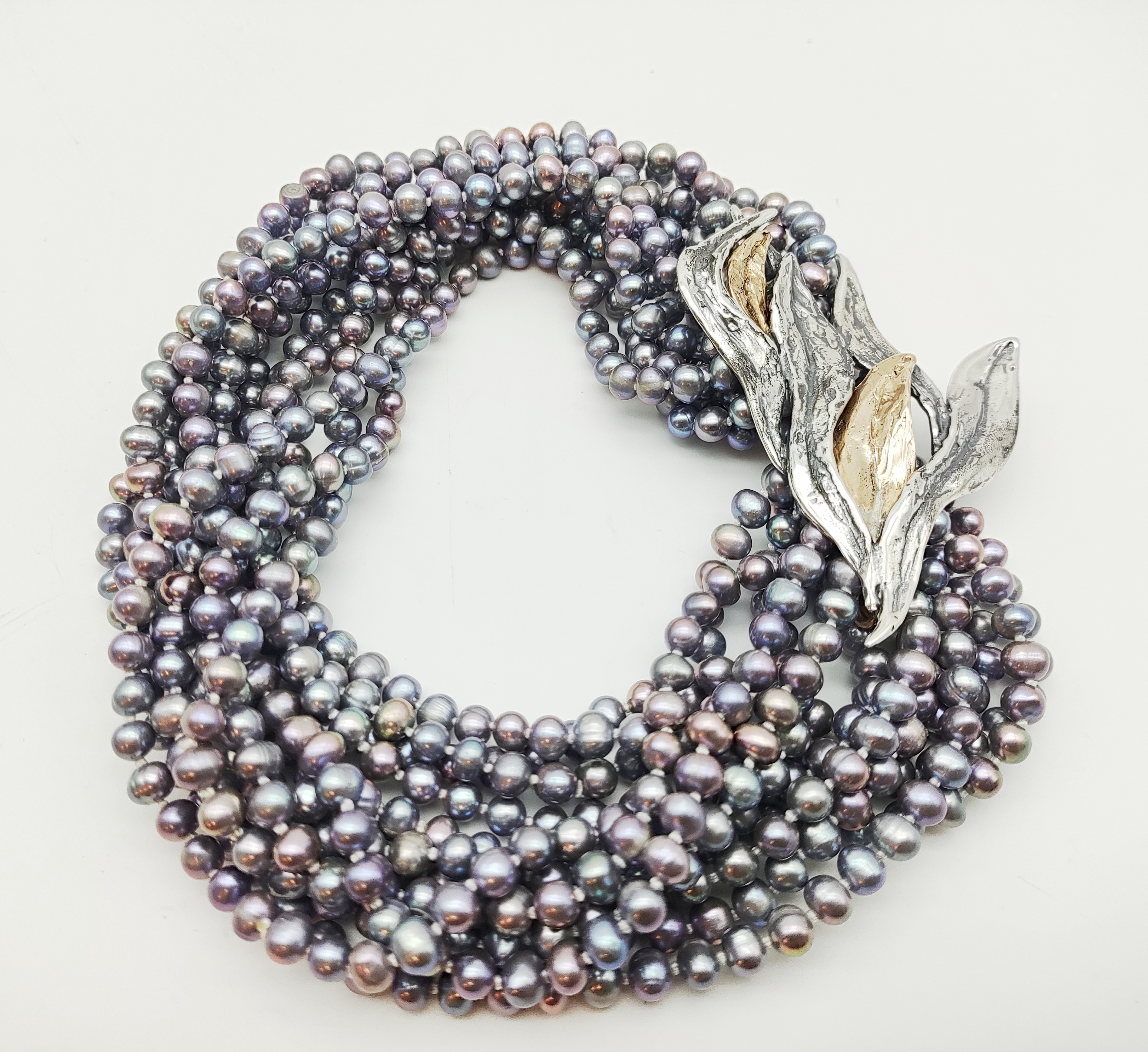 Gray pearl necklace with detachable clasp with natural motif in silver and bronze