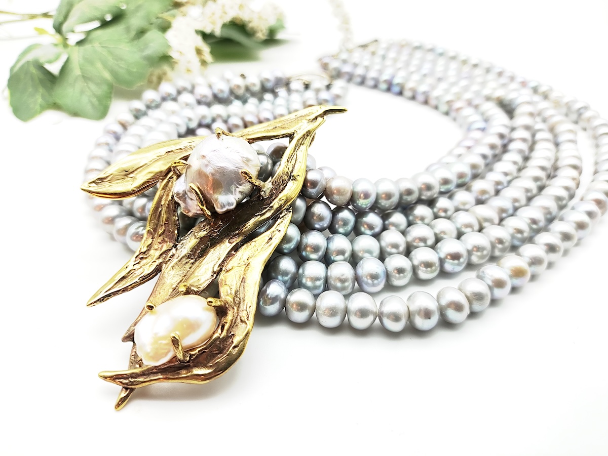 Collana Jungle con elemento a foglie cesellate in bronzo e perle grigie