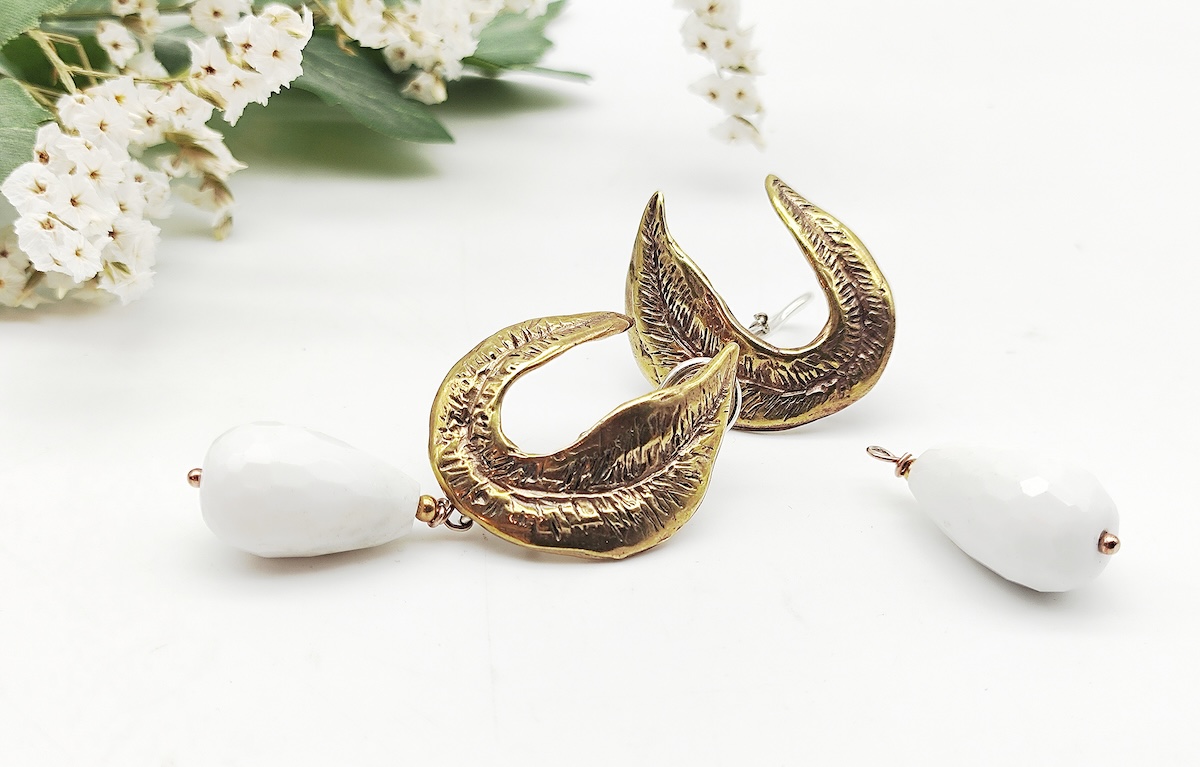 Orecchini in bronzo con foglia cesellata e pietra removibile