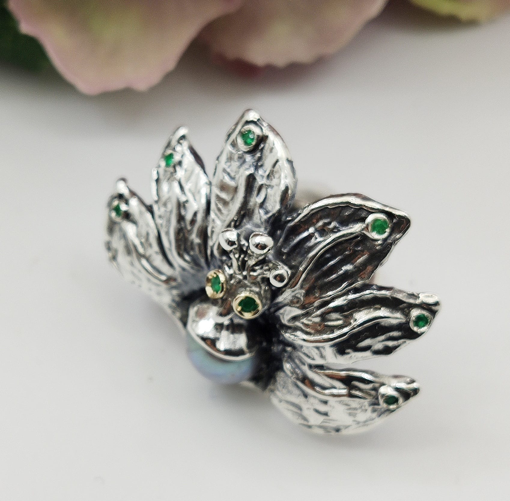 Anello con pavone in argento (corpo e piumaggio) con occhi e punta delle piume in smeraldi. Perla centrale
